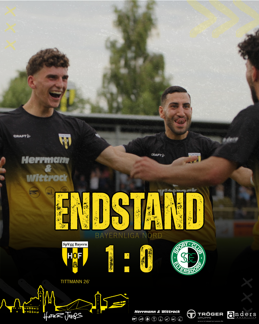 Vor über 600 Fans auf der Grünen Au besiegten die Hofer Jungs den SC Eltersdorf mit 1:0. Den goldenen Treffer erzielte Paul Tittmann nach einem schönen Spielzug mit Durkan in der 26. Minute.