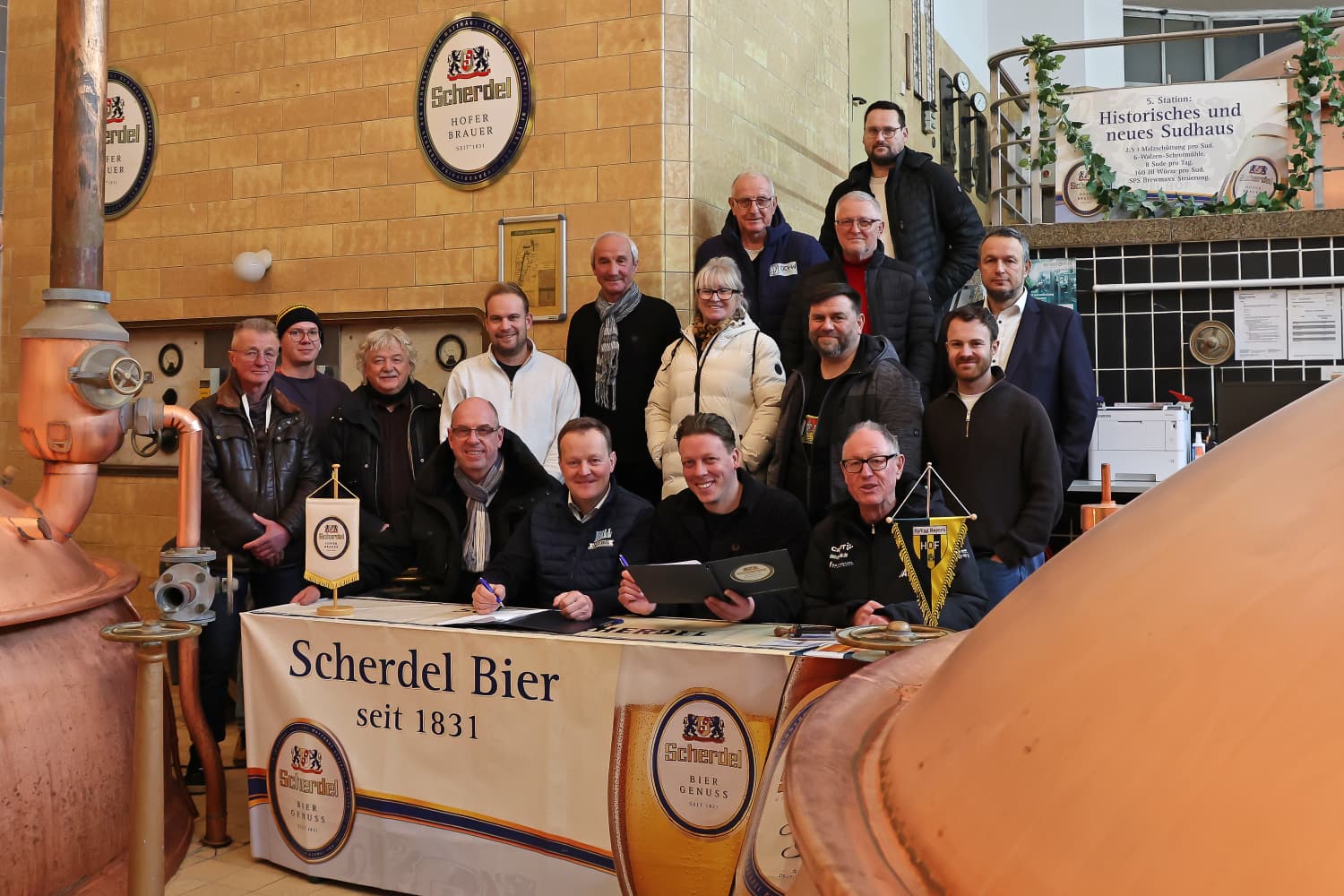 Anlässlich der Verlängerung war eine Delegation der Hofer Bayern zu Gast in der Brauerei. Gemeinsam mit Kurt Unverdorben, Prokurist der Scherdel Bier GmbH & Co. KG, erhielt der Verein eine exklusive Führung durch die traditionsreiche Brauerei. Der neue Sponsoring-Vertrag wurde anschließend feierlich im Sudhaus unterzeichnet – standesgemäß und als sichtbares Zeichen der engen Verbundenheit zwischen Verein und Brauerei.