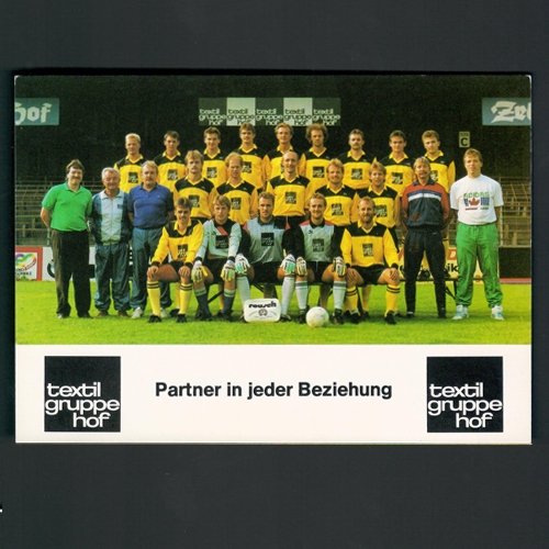 FC Bayern Hof 1910 – Spielerkader 1989/90 hintere Reihe stehend v.l.: Volker Köcher, Klaus Opel, Gerald Weinrich, Jörg Hermann, Udo Schinner, Gregor Platzer, Jürgen Gahn, Helmut Melzner, Thomas Bargenda; mittlere Reihe v.l.: Masseur Roland Peetz, Betreuer Fritz Müller, Spielleiter Peter Fränkel, Uwe Fischer, Roland Hayn, Jürgen Meisel, Michael Steinhäuser, Roland Nickl, Co-Trainer Werner Sonntag, Trainer Wolfgang Mahr; vorne sitzend v.l.: Stefan Stadelmann, Ulrich Resch, Markus Praschil, Detlef Goller, Lothar Goller.